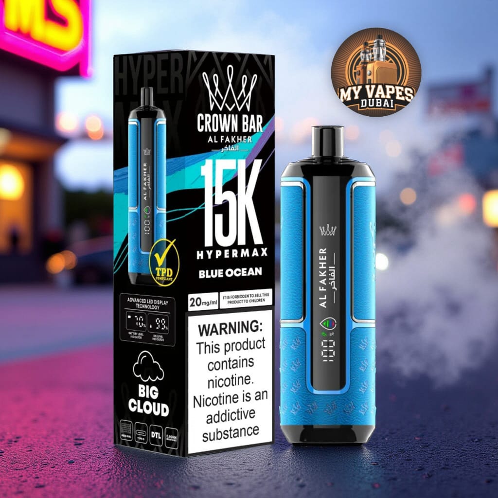 The Al Fakher Crown Bar Hypermax offers up to 15,000 puffs, providing long-lasting enjoyment.